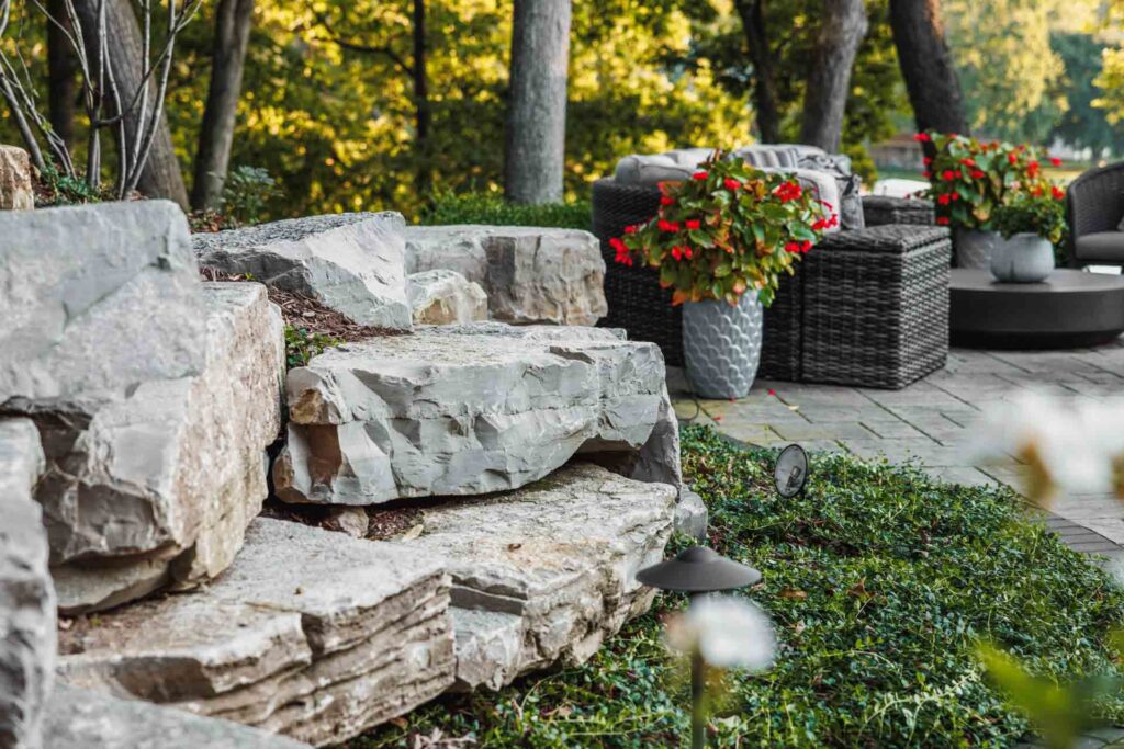Natural outcropping ledgestone was used on the hillside to provide both structure and a seamless transition into the environment. The stonework acts as a subtle anchor for the space, enhancing the design without distracting from the view. It’s a perfect example of how Walden Design balances form and function to celebrate nature while supporting your lifestyle.